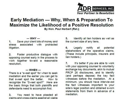 Retired judge Paul D. Herbert has developed a particular fondness in his work as an ADR Services, Inc. private neutral. "My first love is mediation and settlement," Herbert said. "I'm happy to be an arbitrator and a referee if that's the service folks need, but my preference is to do mediations and help people get out of the system and back to their regularly scheduled lives."